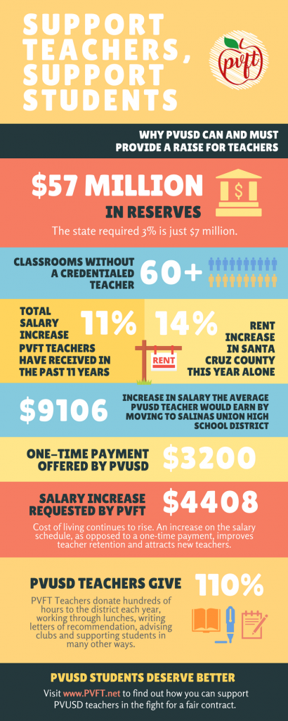 The Union is asking for fully credentialed first year teacher’s salary to start at $50,000. PVUSD currently starts at $43,971 while Salinas High School Unified starts at $49,934, plus a signing bonus.
